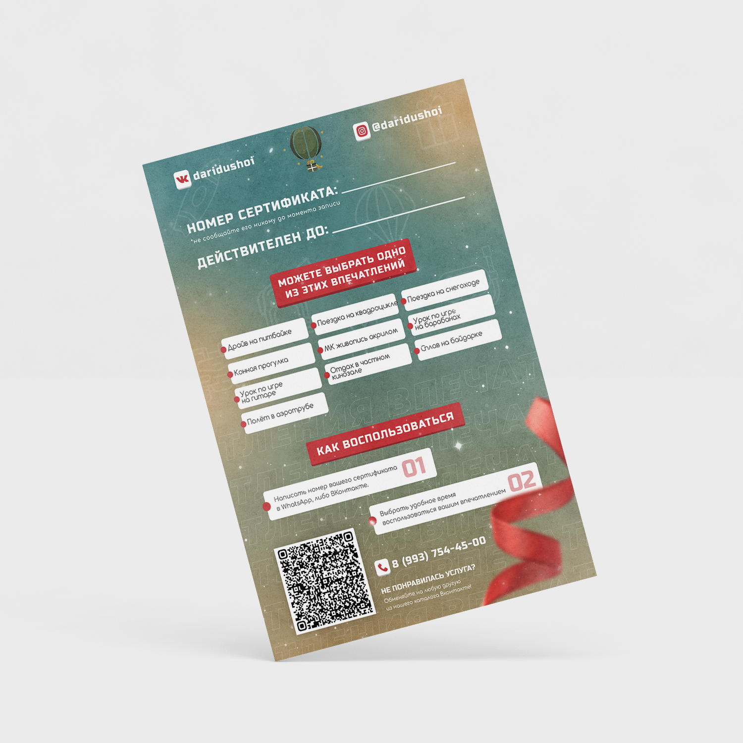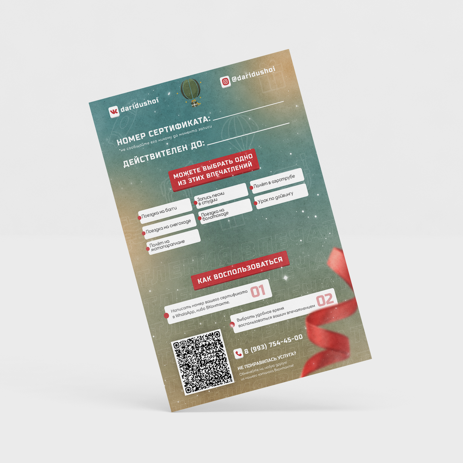 Боитесь не угадать с подарком? Подарите сертификат с набором впечатлений! На обратной стороне сертификата указан список впечатлений из которых можно выбрать любое понравившееся. Есть наборы на разные суммы и впечатления. Подробнее смотрите в каталоге.