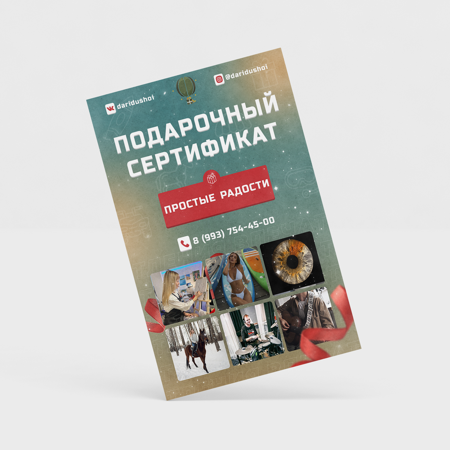 1.Занятие по игре на барабанах 2.Занятие по игре на гитаре 3.Фото радужки глаза (формат А4) 4.Конная прогулка (30 мин) 5.Сплав на байдарке 6.Сплав на Sup-борде 7.Мастер класс «Живопись акрилом» (холст 18*24)